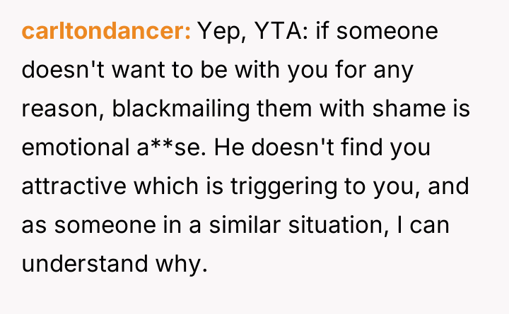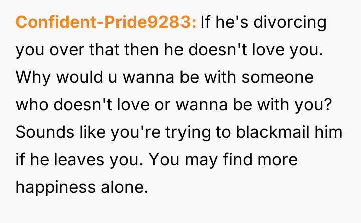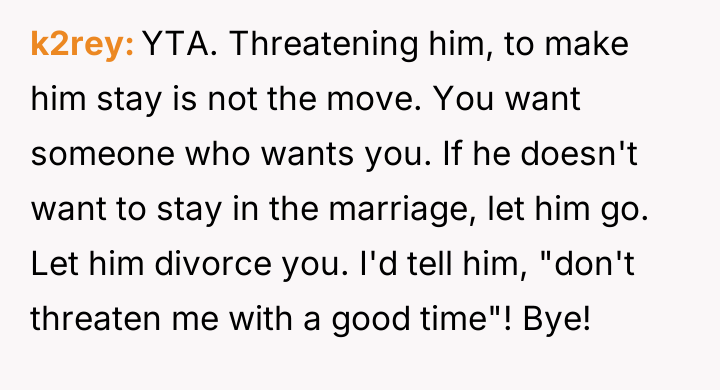 Is it justifiable for a spouse to use the threat of revealing sensitive information about the marriage's end to prevent a divorce initiated by the other partner's dissatisfaction with physical appearance, or does this action cross a line into emotional manipulation?