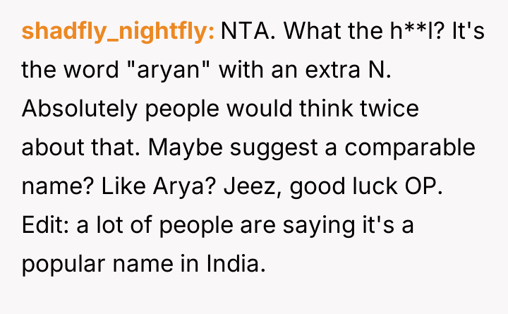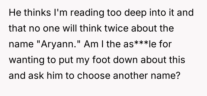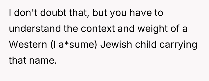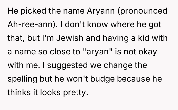 The original poster (OP) experienced significant distress and alarm upon learning the name her husband selected, Aryann, carried strong historical connotations that deeply conflicted with her Jewish identity.