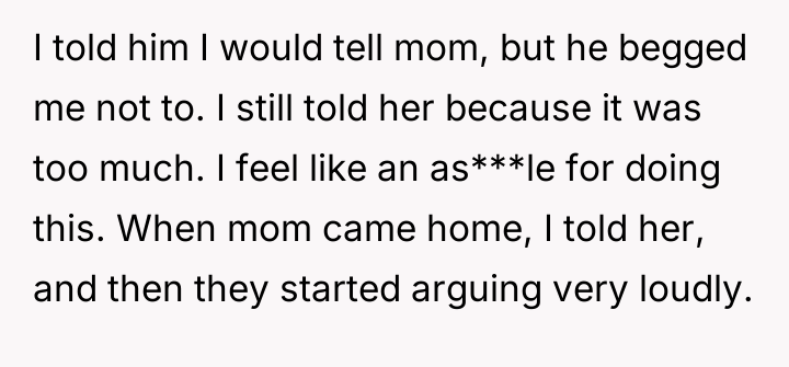 The core tension lies between the OP's justifiable reaction to abuse and the subsequent guilt felt over reporting the stepfather's words, which fractured the marital dynamic.