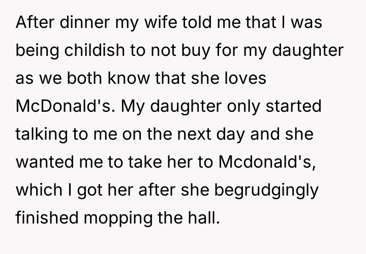 The OP responded to his daughter's rudeness by withholding a treat she desired, an action his wife later criticized as immature, highlighting a breakdown in handling the emotional fallout from the initial chore dispute.