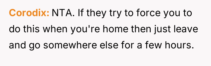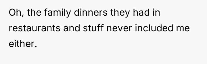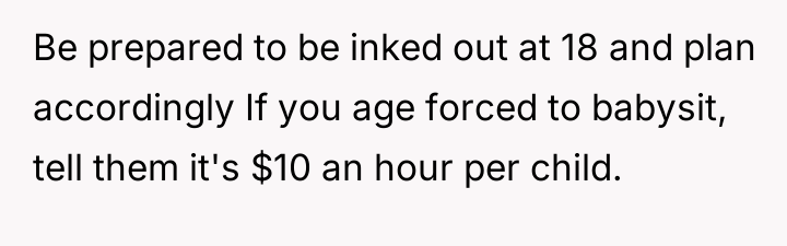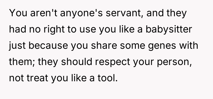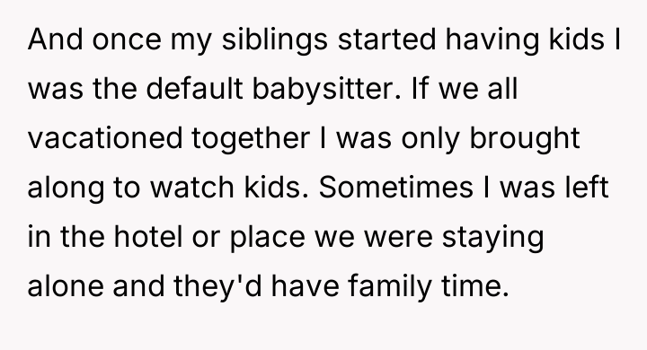 This pattern continued into his teenage years where he became the default, unpaid babysitter for his siblings' children, leading him to question his place and finally decide to set firm boundaries.