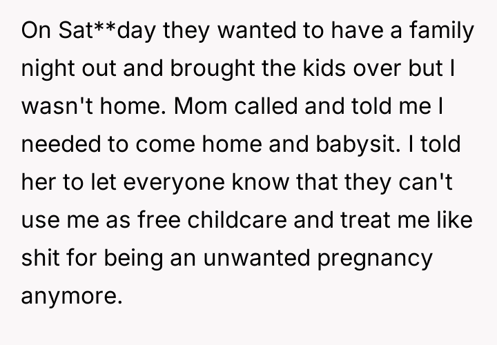 AITA for refusing to babysit for my siblings anymore and telling my family they can't use me as free childcare and treat me like shit for being an unwanted pregnancy?
