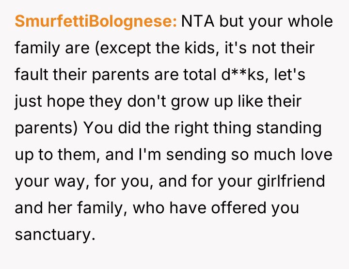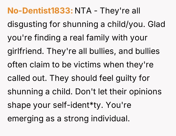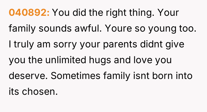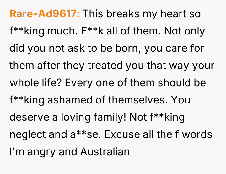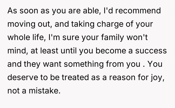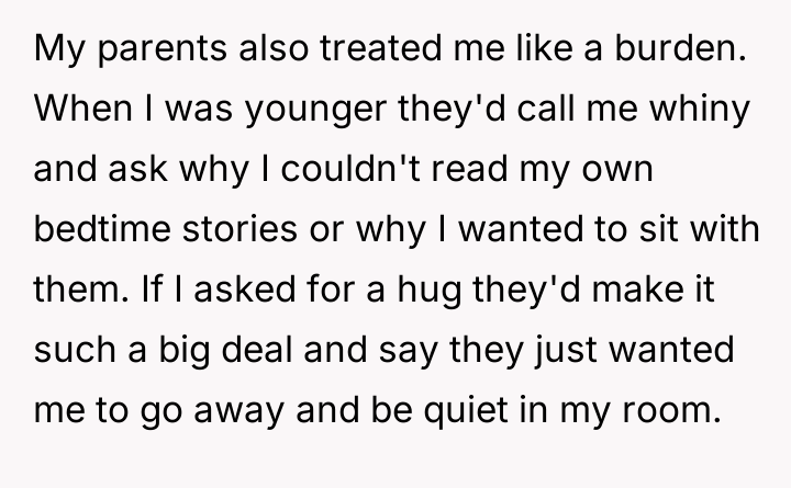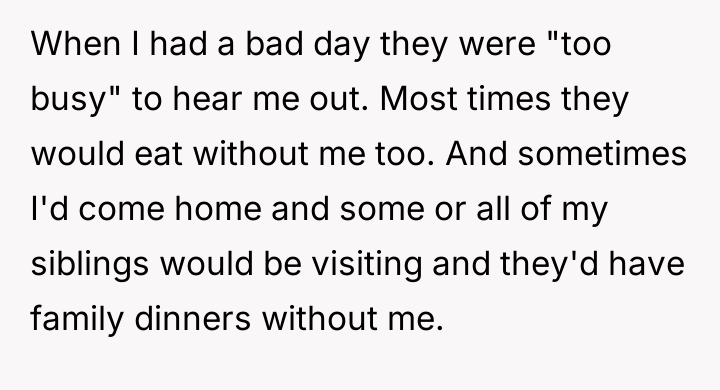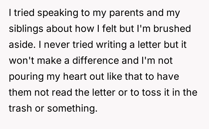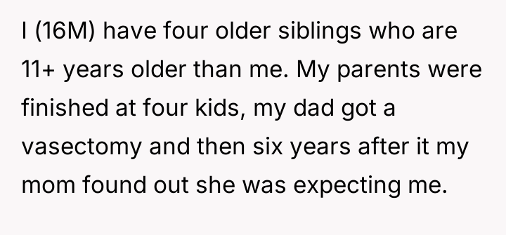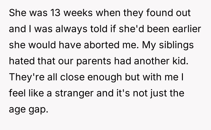 His four older siblings, who are all more than eleven years his senior, reportedly resented his arrival, sometimes calling him "mom and dad's mistake." The feeling of being an outsider extended to his parents, who the poster claims treated him like a burden, often dismissing his needs for attention or comfort when he was younger.