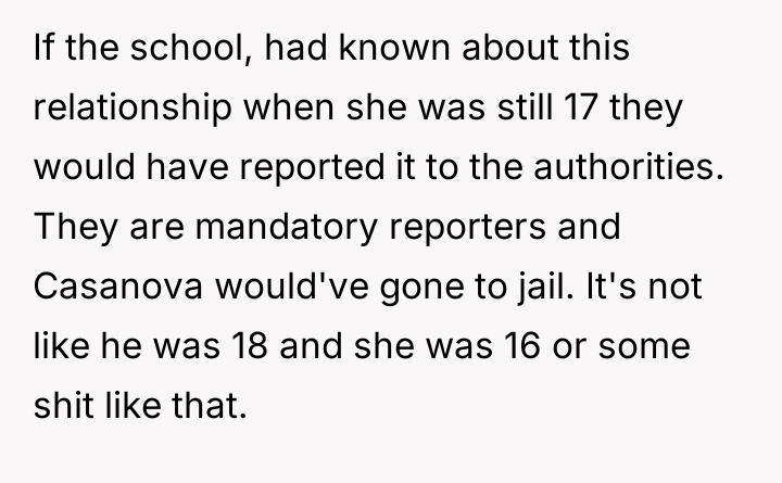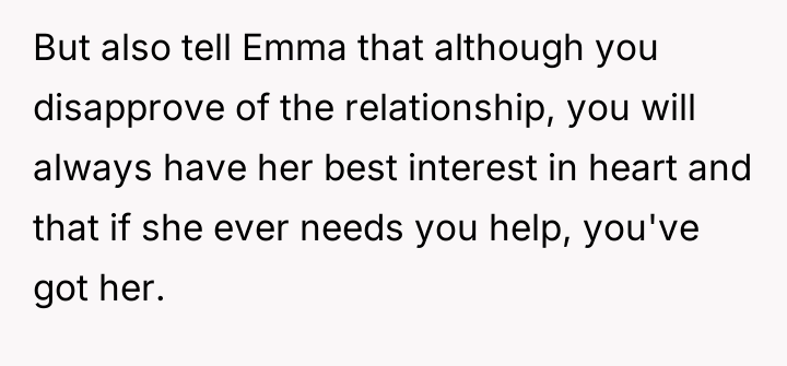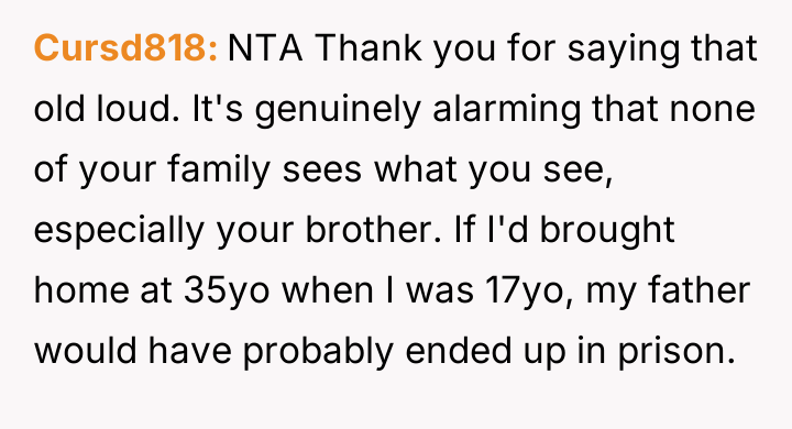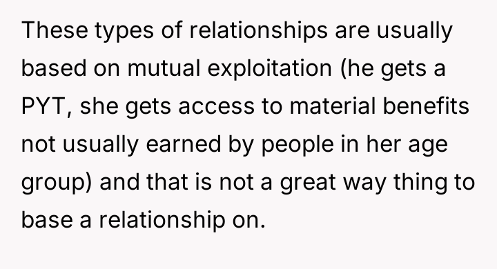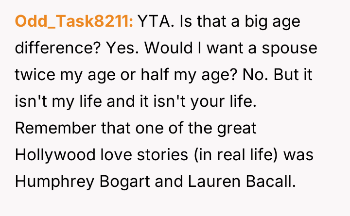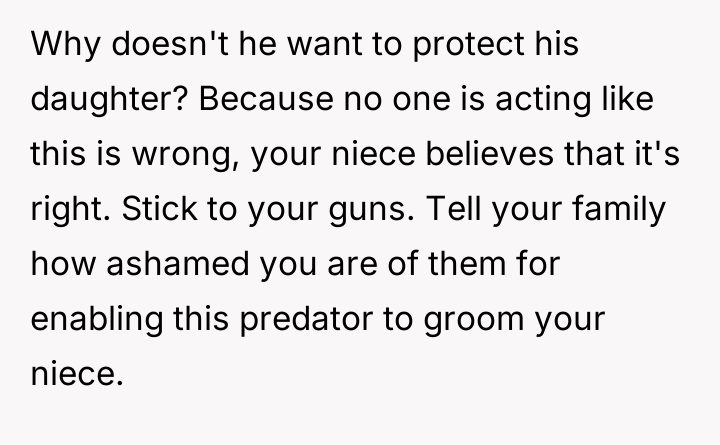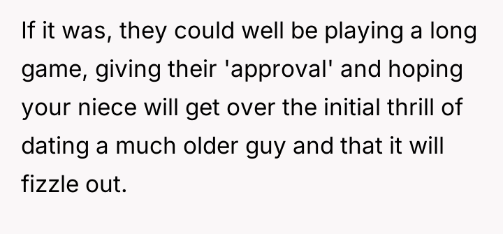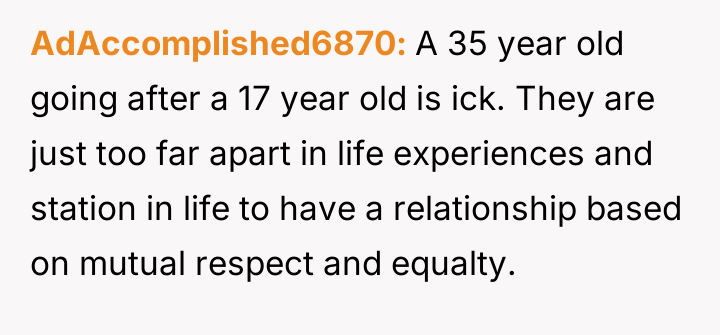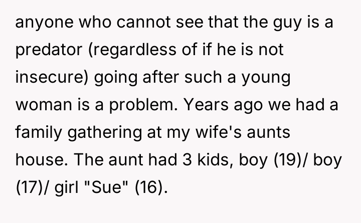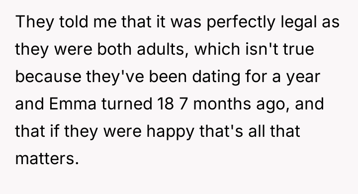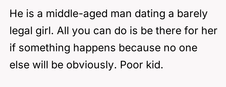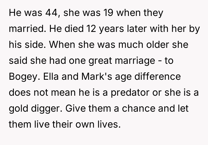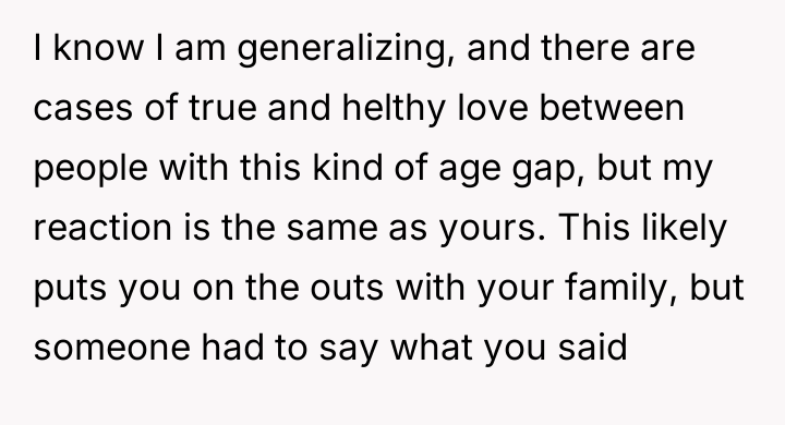 While the family focuses on the legality and the couple's happiness, the poster is focused on the potential for future harm and the perceived inappropriateness of the significant age difference.