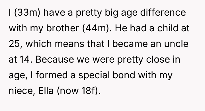 The individual posting (33M) has a close relationship with his niece, Ella (18F), due to the relatively small age gap between him and his brother (44M), which made him an uncle at age 14.