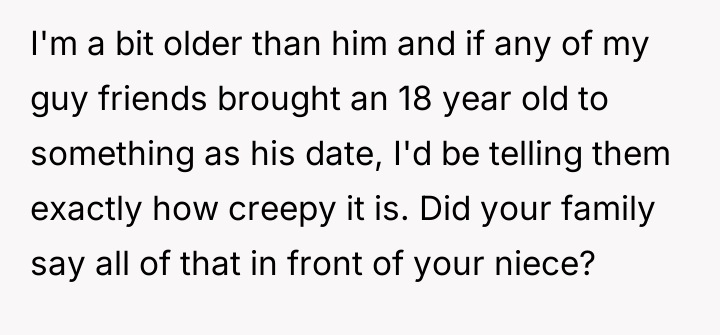 The poster reacted strongly by swearing and calling the relationship inappropriate, leading to accusations from the family that he ruined the celebration, leaving him questioning his reaction and concerned for his niece's future.