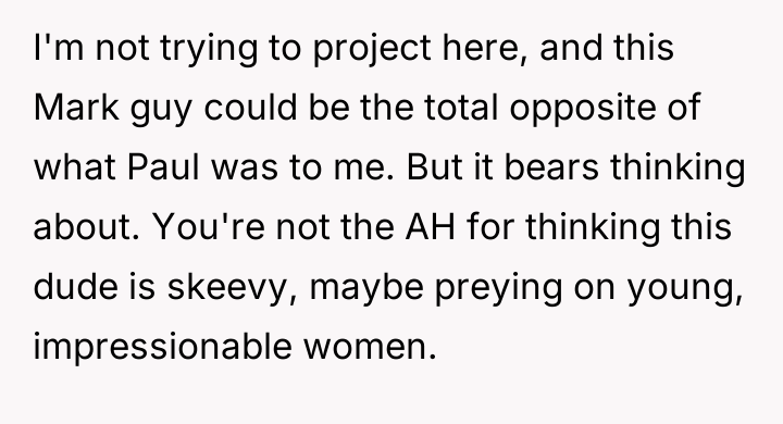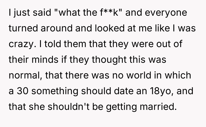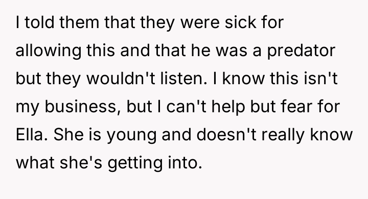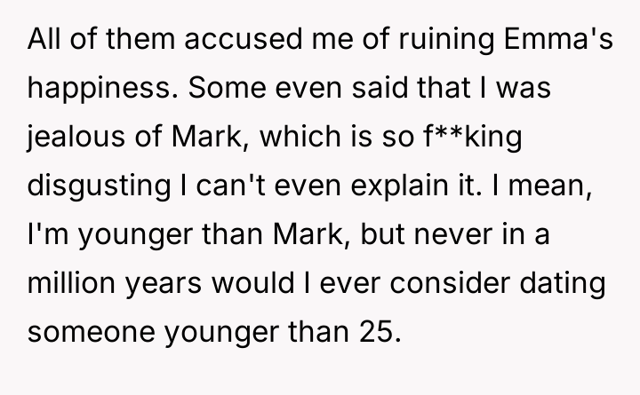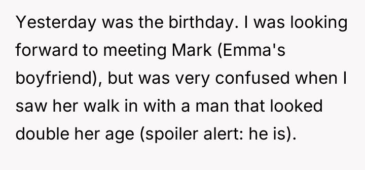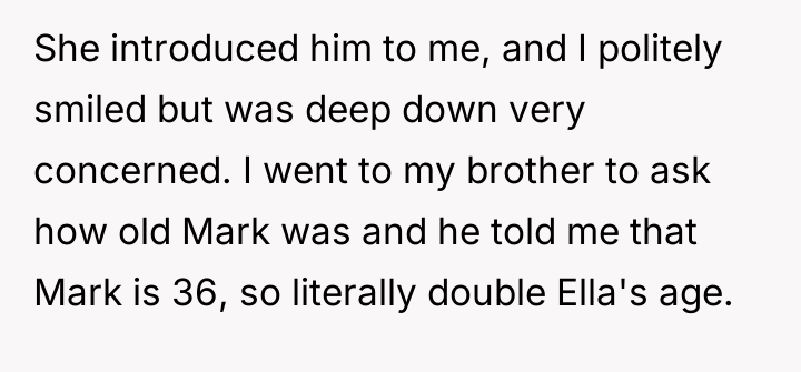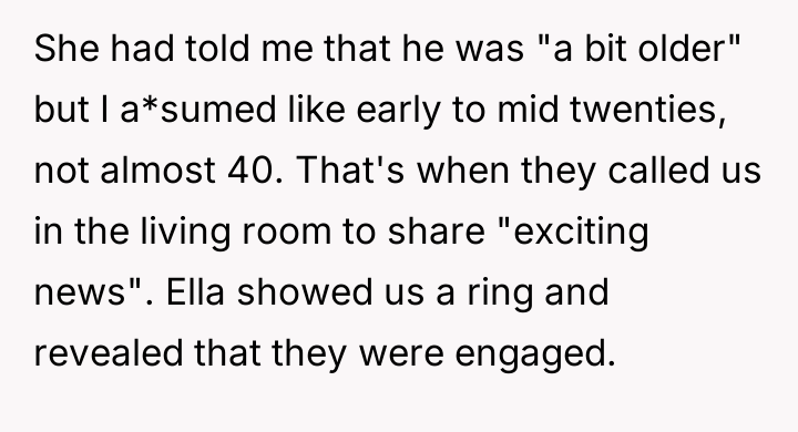 When Ella's boyfriend, Mark, was finally invited to a family event, the poster was shocked to discover Mark was 36, nearly double Ella's age. The situation escalated quickly when Ella announced they were engaged.