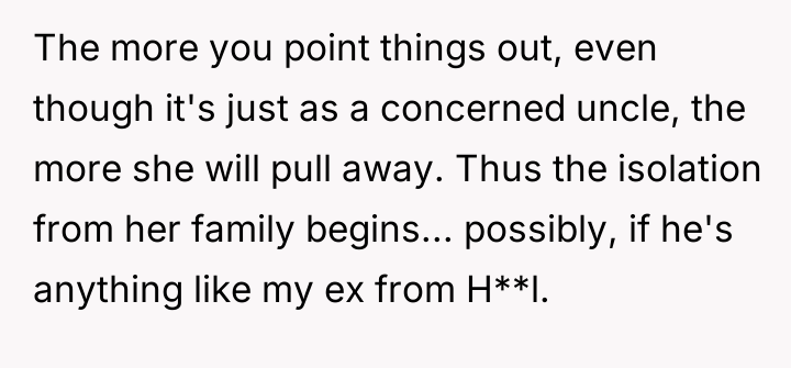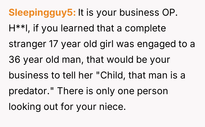 The poster is experiencing significant emotional conflict stemming from his protective feelings toward his young niece and the strong disapproval he feels regarding her engagement to a much older man.